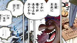 ONE PIECE 【ワンピース】ビッグ・マムがカイドウへ言った「でかい借り」と「一生の恩」は悪魔の実?ウオウオの実を手に入れた経緯が判明 ホールケーキアイランド編のラスト、ルフィがビッグ・マム海賊団からサンジを取り戻して出航した後に描かれた世界情勢の最中にて、ビッグ・マムがカイドウと接触をはかります。その際、ビッグ・マムはカイドウに対して「お前おれにでかい借りがあるよね、カイ... 2025.12.25 ONE PIECE